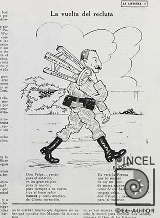 Autor Hernández, Francisco Título La vuelta del recluta Técnica GrabadoOtros Año 1913 Temática Ilustración Caricatura Otros Datos La Linterna 1 Agos 1913 Tomado de internet www.sinabi.go.cr Palabras Clave Crítica - Burla - Chota - Política