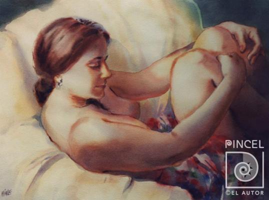 Autor Hine, Ana Griselda Título Modelo recostada Técnica PinturaAcuarela Año Sfch Medidas 52 x 74 cm Temática Composición con figura Otros Datos Palabras Clave Figura - Mujer - Recostada - Pierna flexionada - Vestido - Aretes - Descanso