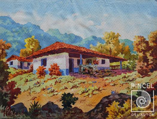 Autor Pacheco, Fausto Título Dos casas Técnica PinturaAcuarela Año Sfch Medidas 33.5 x 43 cm Temática Paisaje Otros Datos Fueron comprados por dueño de una Litografía directamente a Fausto. Palabras Clave Paisaje - Cielo - Nubes - Vegetación - Campo - árboles - Arbustos - Casas - Típicas - Adobe - Tejas - Verano - Asoleado - Macetas - Corredor