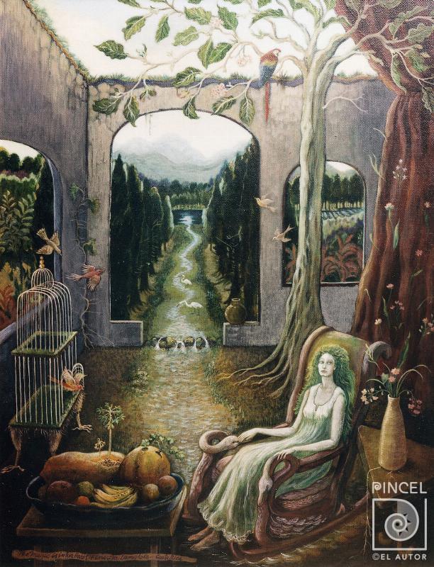 Autor Sáenz de Langlois, Flora Título The magic is in her heart Técnica PinturaAcrílico Año Sfch Temática Alegoría Paisaje Interior Palabras Clave Camino - árboles - Lapa - Mujer - Mecedora - Jaula - Aves - Ventanas - Puertas - Mesa - Gansos - Aves - Frutas - Florero - Jarrón - Flores - árbol - Agua - Río - Enredadera - Zacate - Mágico - Místico - Descalzo - Mesa - Río