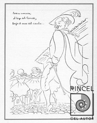 Este dibujo es una de las ilustraciones del libro "Mulita Mayor" de Carlos Luis Sáenz. Editorial CR. 1981. El dibujo dice: Pase a casarse, el hijo del conde, bajo el arco del canto ..."