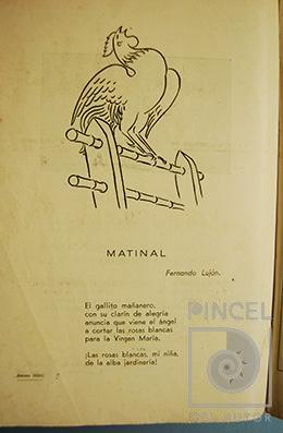 Autor Sánchez, Juan Manuel Título Matinal Técnica GrabadoImpreso Año 1953 Medidas 10 x 7.5 cm Temática Ilustración Otros Datos Revista Farolito 1953. Pag 16 Palabras Clave Revista Farolito - Matinal - Cerca - Gallo - Cantar - Mañana - Madrugada - Sol - Salir - Animal - Ave