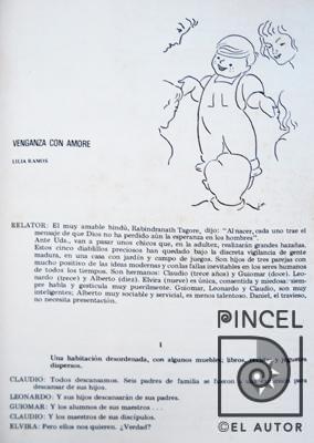 Este dibujo aparece en la obra de Lilia Ramos, Venganza con amore, pag. 115, en el libro Luz y Bambalinas. Antología de teatro para niños de Lilia Ramos. Editorial Costa Rica, San José, 1982.