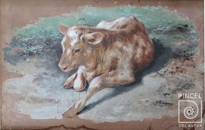 Autor Povedano, Tomás Título Ternerito (Apunte) Técnica PinturaTémpera sobre papel Año Sfch. Medidas 18.5 x 30 cm Temática Animalística Palabras Clave Ternero, vaca, animal, animalística, zacate, sombra, descanso, echado,